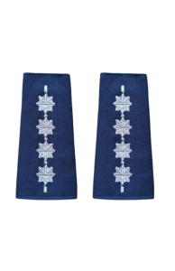 Pagony, pochewki, stopnie naramienne Policji. Wykonane z tkaniny w kolorze granatowym. Oznaczenie stopnia wykonane haftem komputerowym, srebrną metalizowaną nicią.